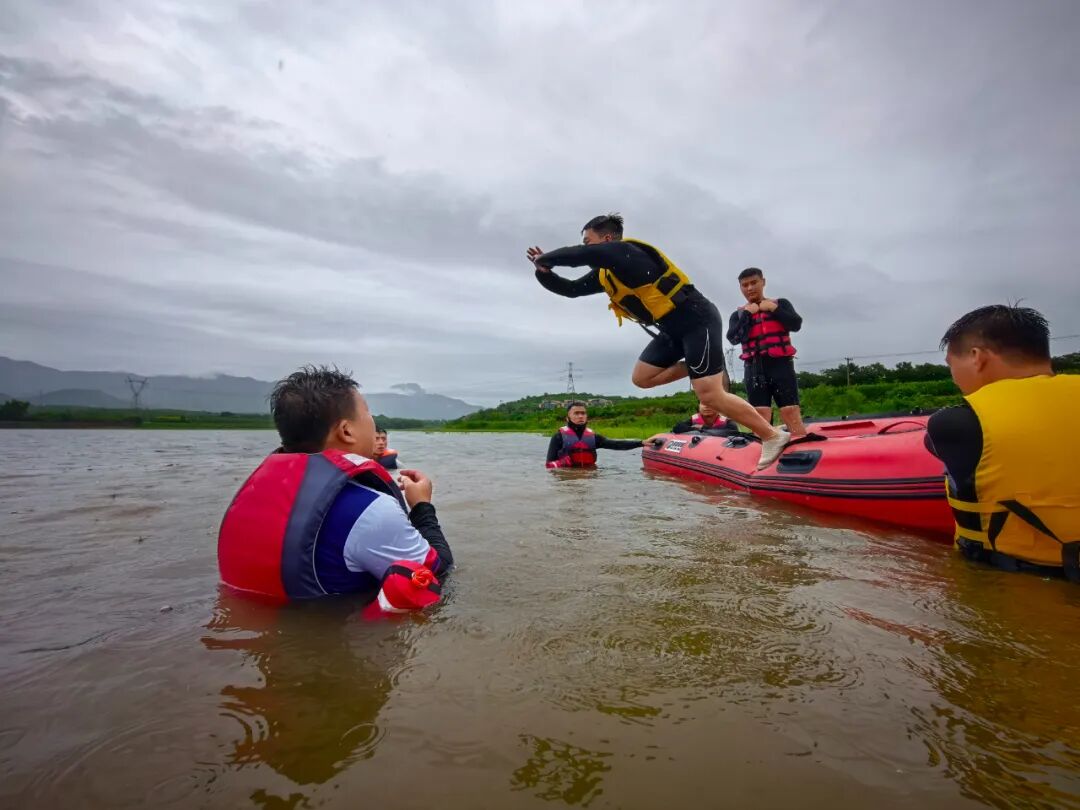 为贴近真实救援场景,训练专门设置抛绳包搜救科目。模拟汛期人员落水情况,队员们发现 “被困人员” 后,迅速抵近实施抛投绳包救援操作,从发现目标到成功施救全程衔接紧密、规范高效。